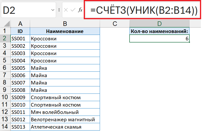 Для определения уникальных значений используется функция УНИК (UNIQUE), а для подсчета количества элементов списка — СЧЁТЗ (COUNTA). Если их совместить, то формула в русской версии получается: =СЧЁТЗ(УНИК(B2:B14)) или в англоязычной =COUNTA(UNIQUE(B2:B14)).