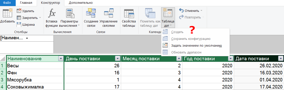 Если внимательно посмотреть, то столбец Дата поставки является Вычисляемым столбцом — это и не позволяет создать календарь. Что же делать в таких случаях, если в исходных данных компоненты даты, на основании которых функцией вычисляется дата? В этом случае, источник надо предварительно обработать через Power Query, а затем загрузить в модель Power Pivot.